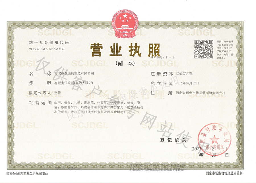 河北誠泰座椅制造有限公司是影院座椅、禮堂、會議座椅、影院臺階燈等產品加工的公司,擁有完整、科學的。河北誠泰座椅制造有限公司的誠信、實力和產品質量獲得業界的認可。歡迎各界朋友蒞臨參觀、指導和業務洽談。